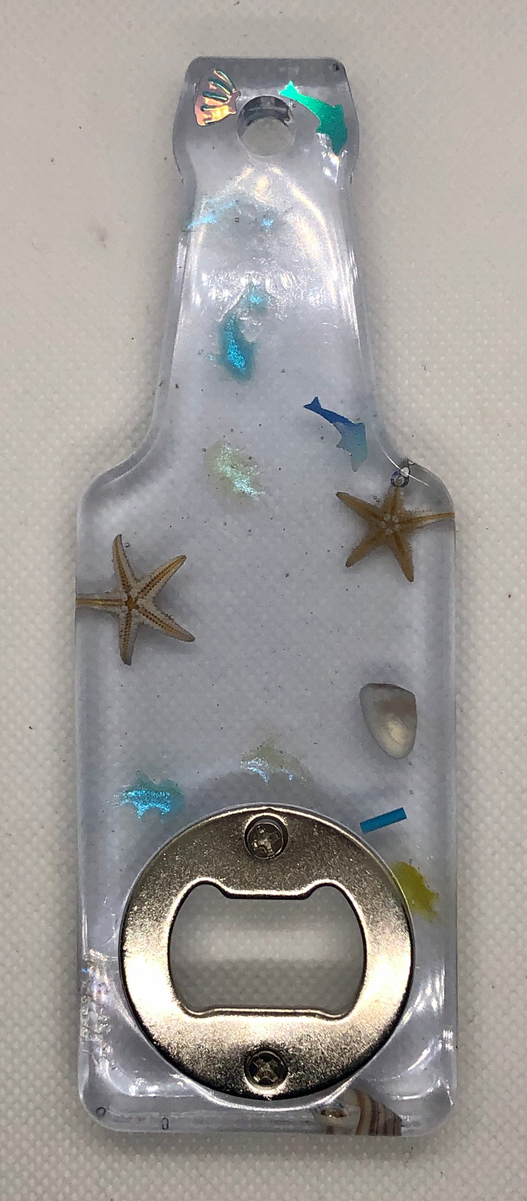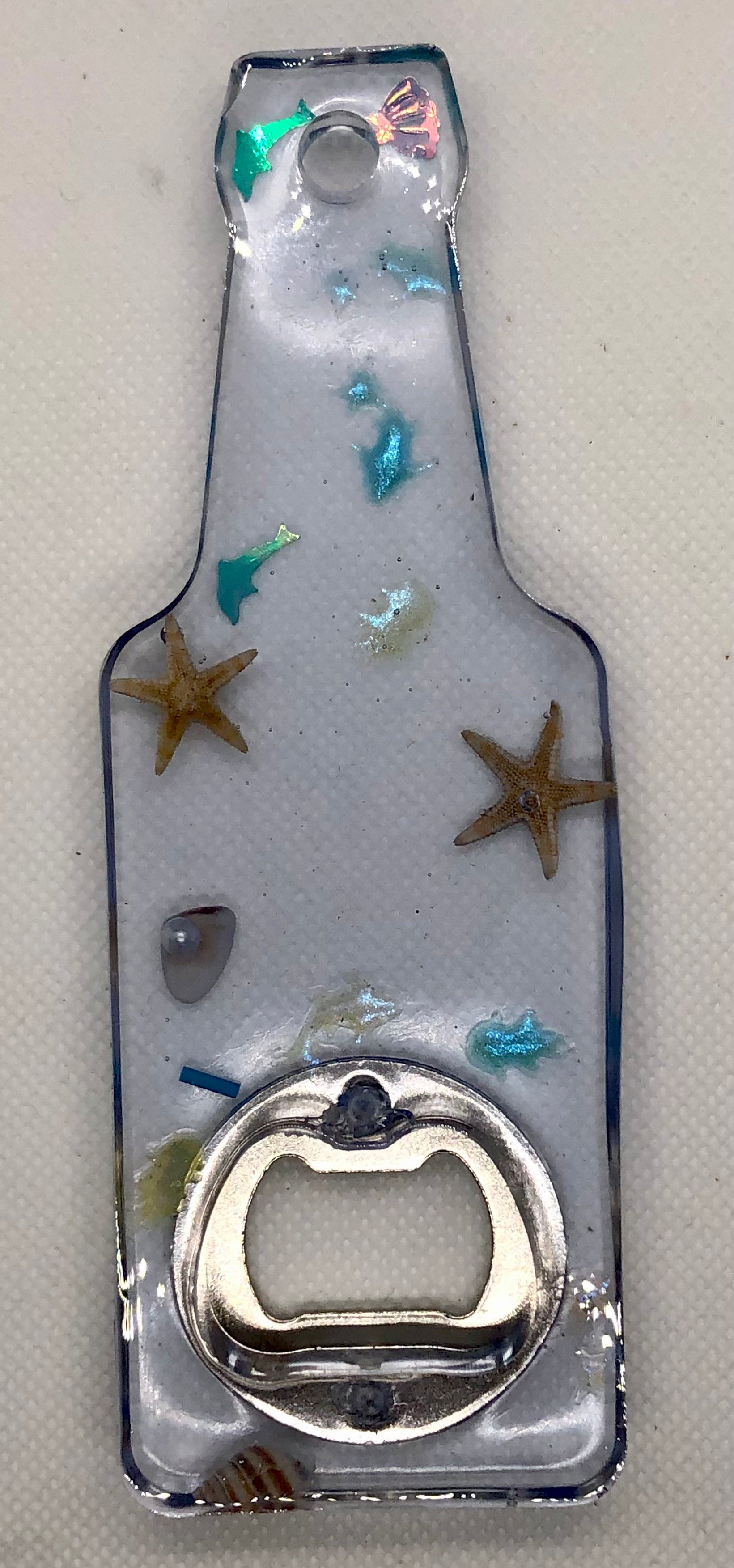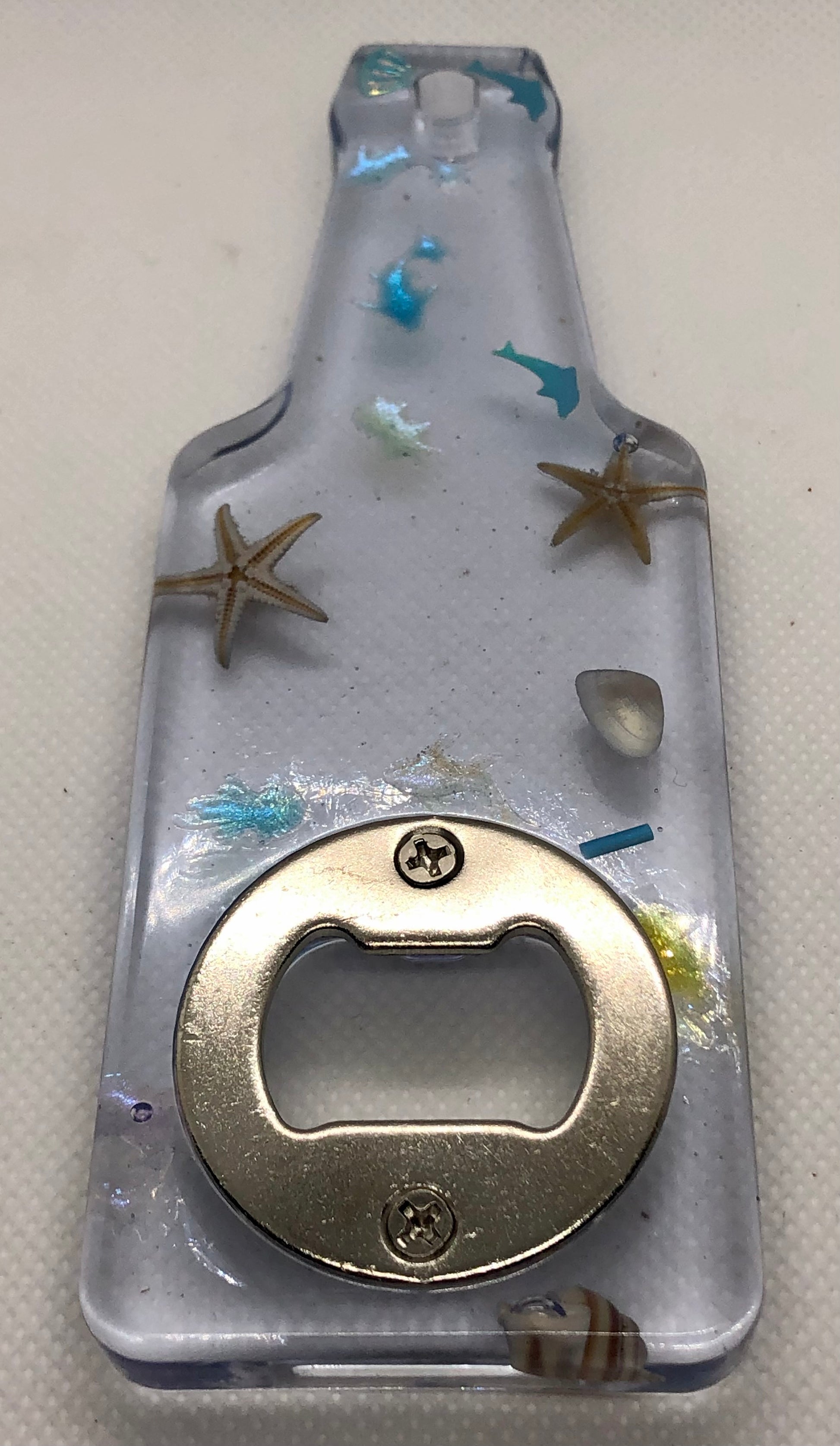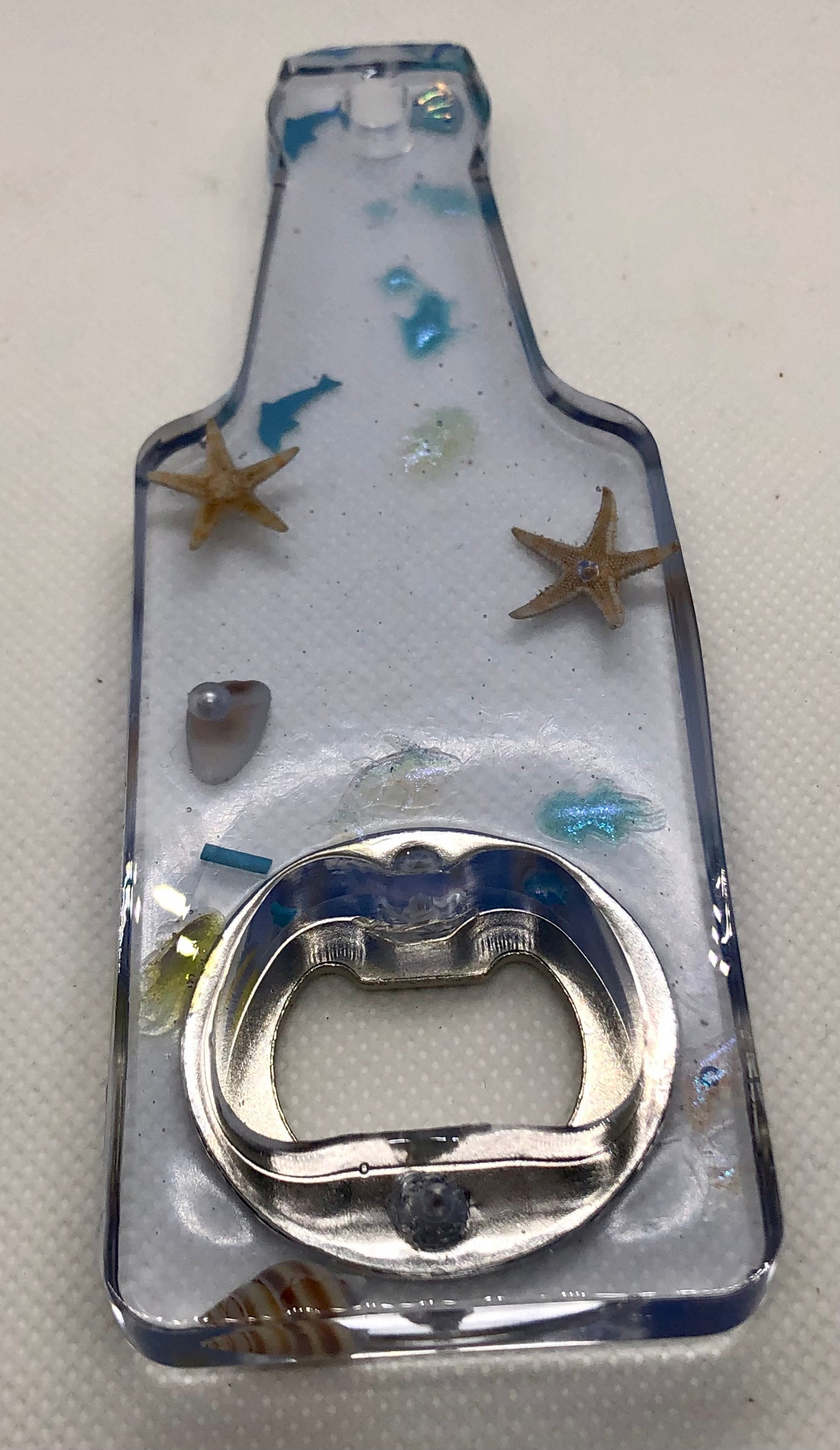 Décapsuleur manuel en résine transparent. Insertion de petits objet sur le thème de l’océan.