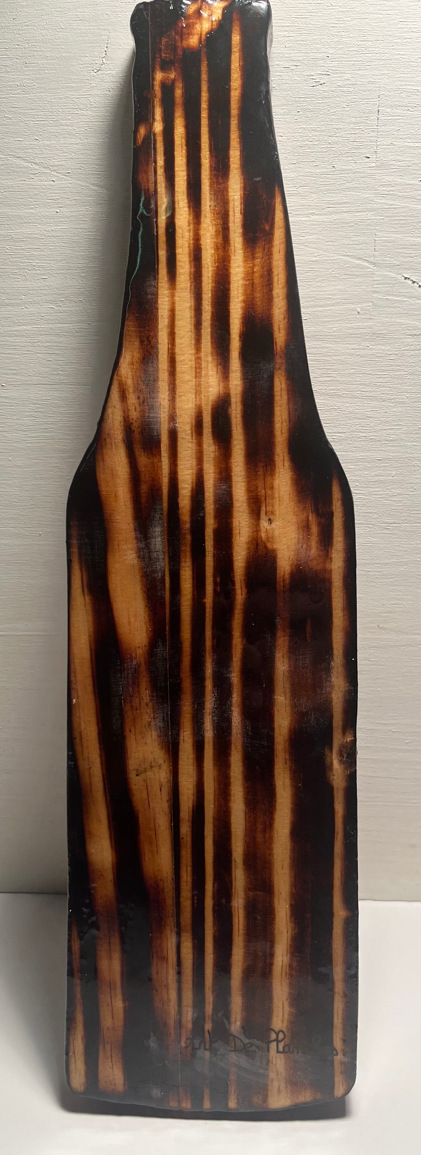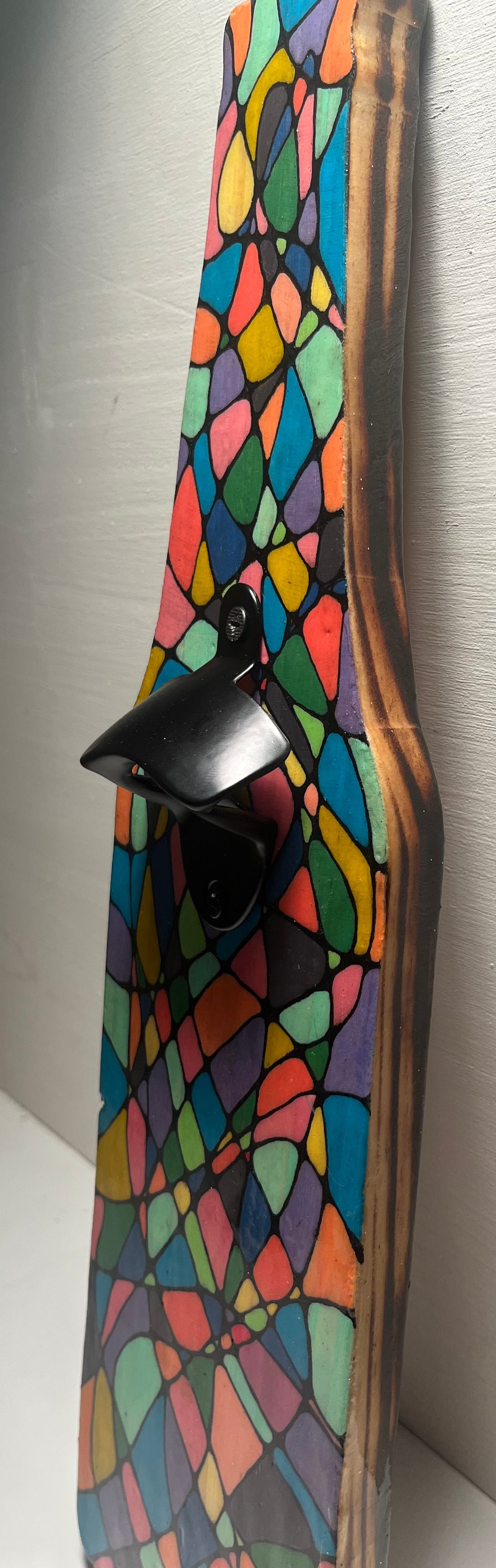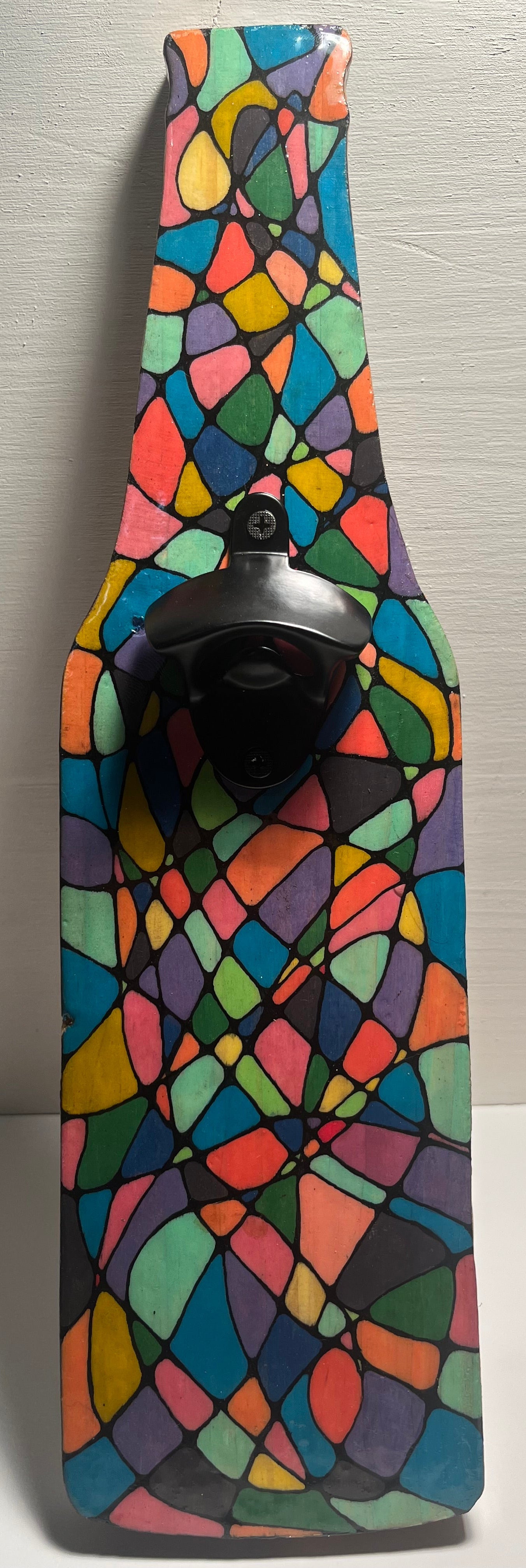 Décapsuleur mural, formes géométriques. Support en bois brulé, dessin en peinture, et vernis à la résine