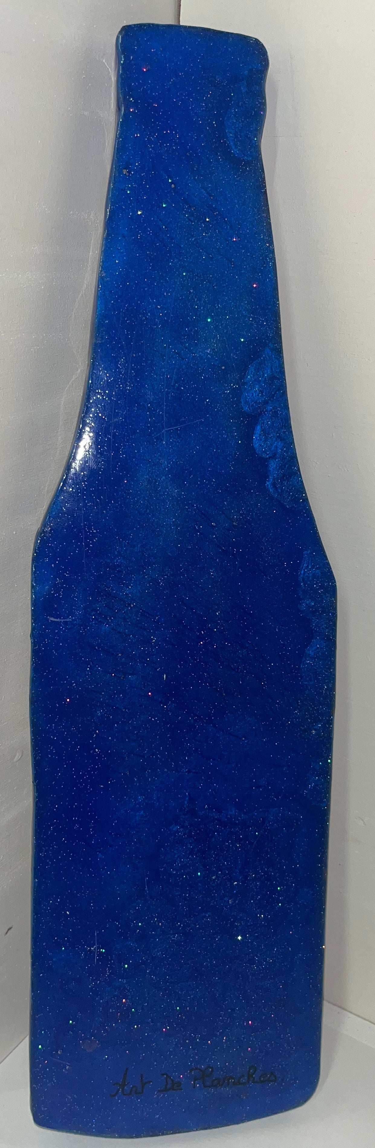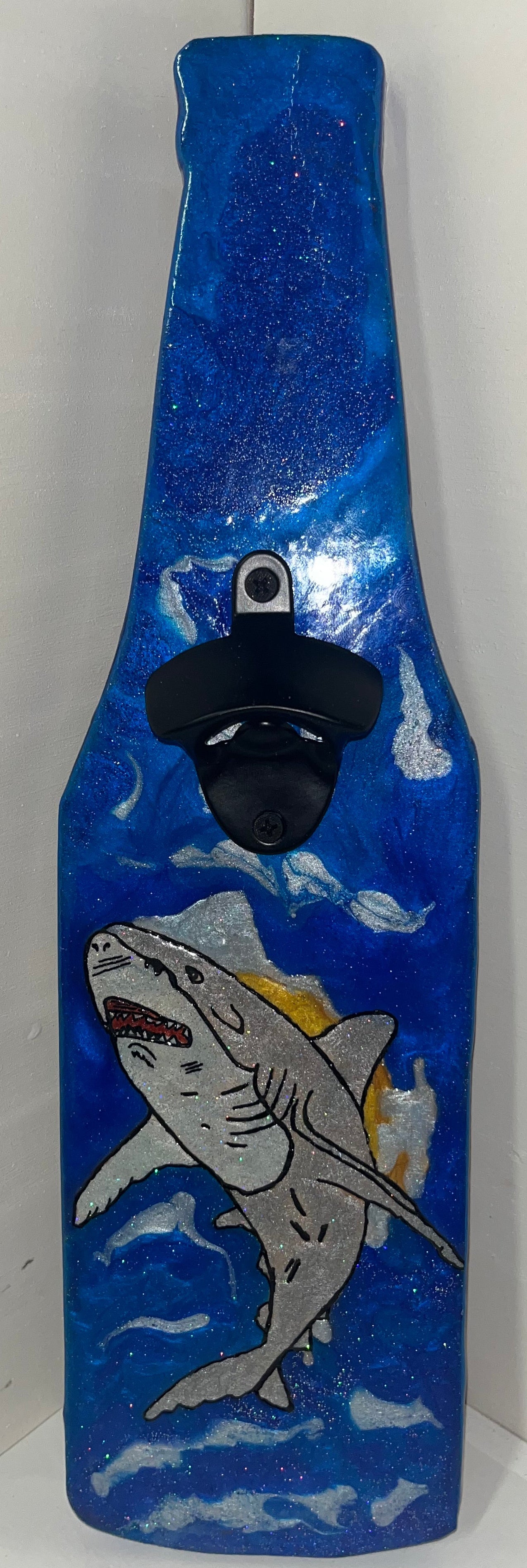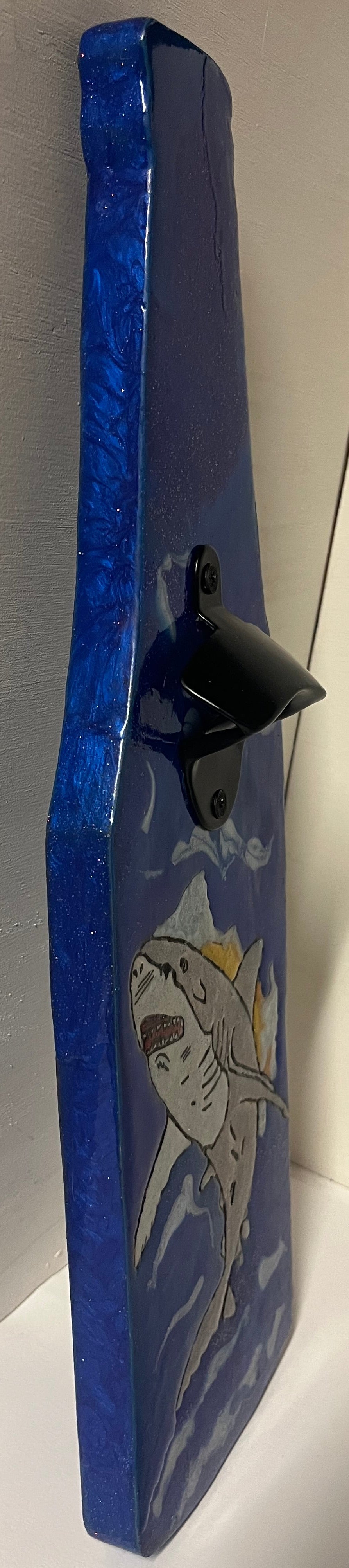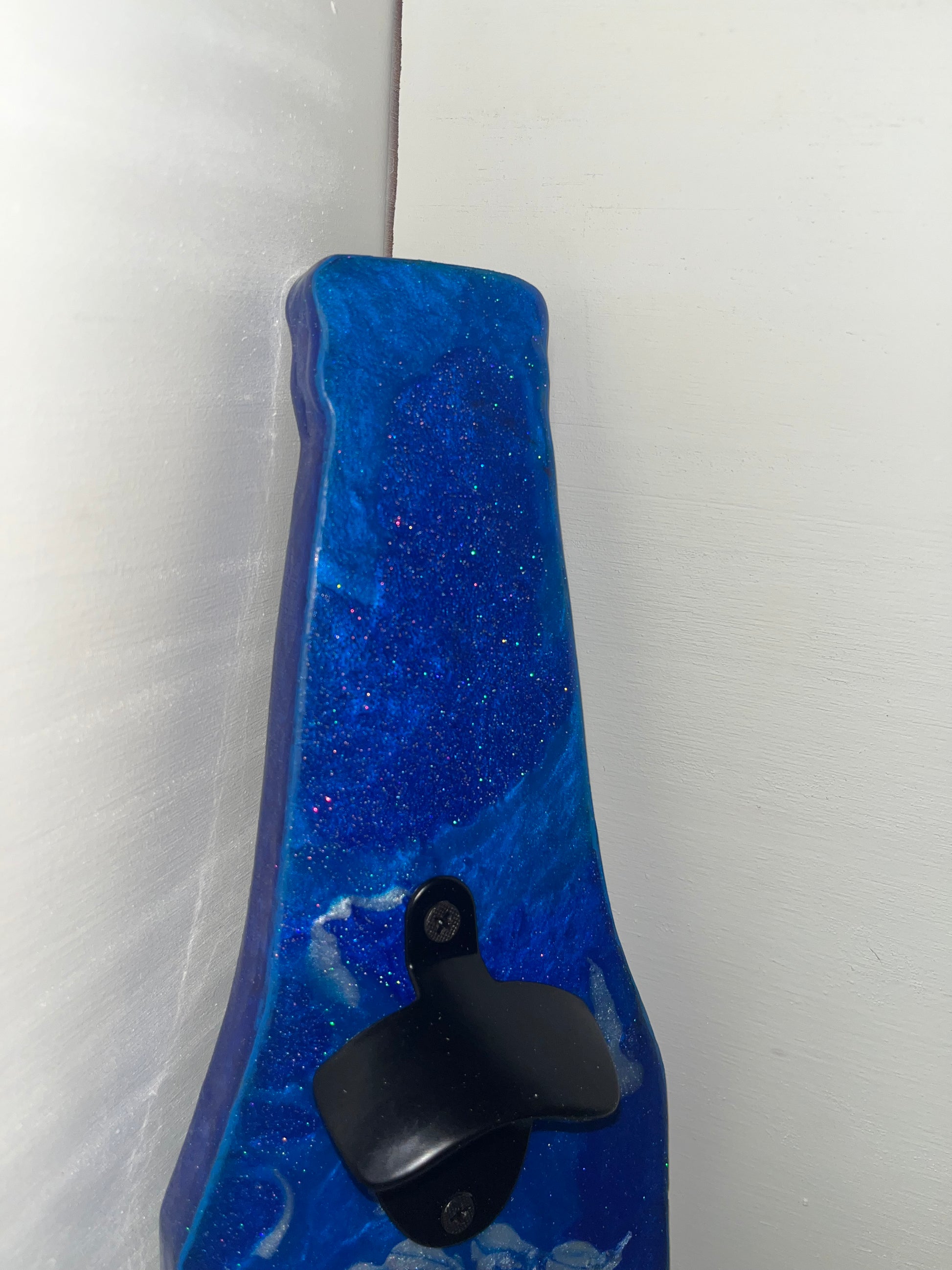 Décapsuleur mural sur support en bois. Dessin en résine.