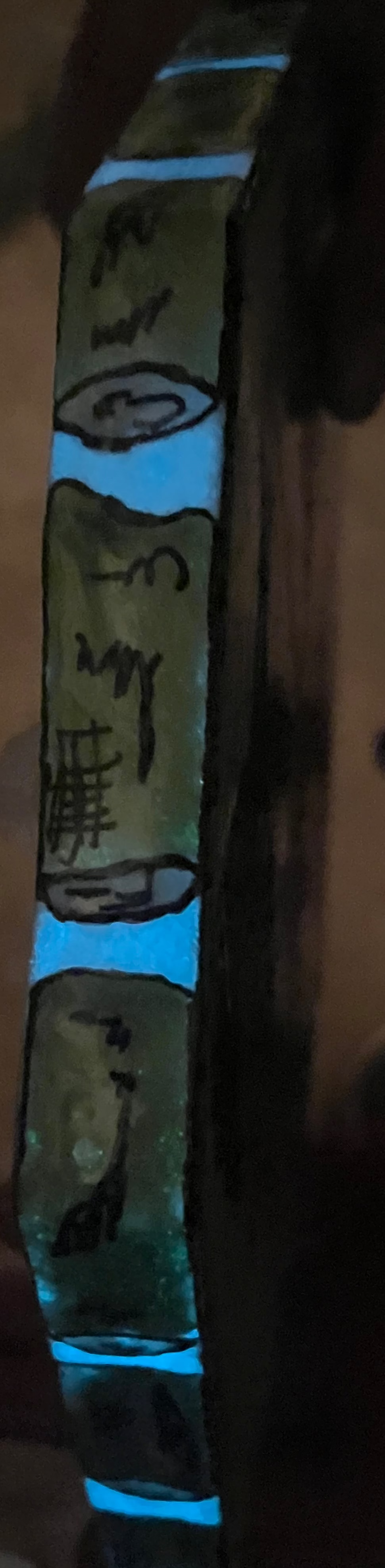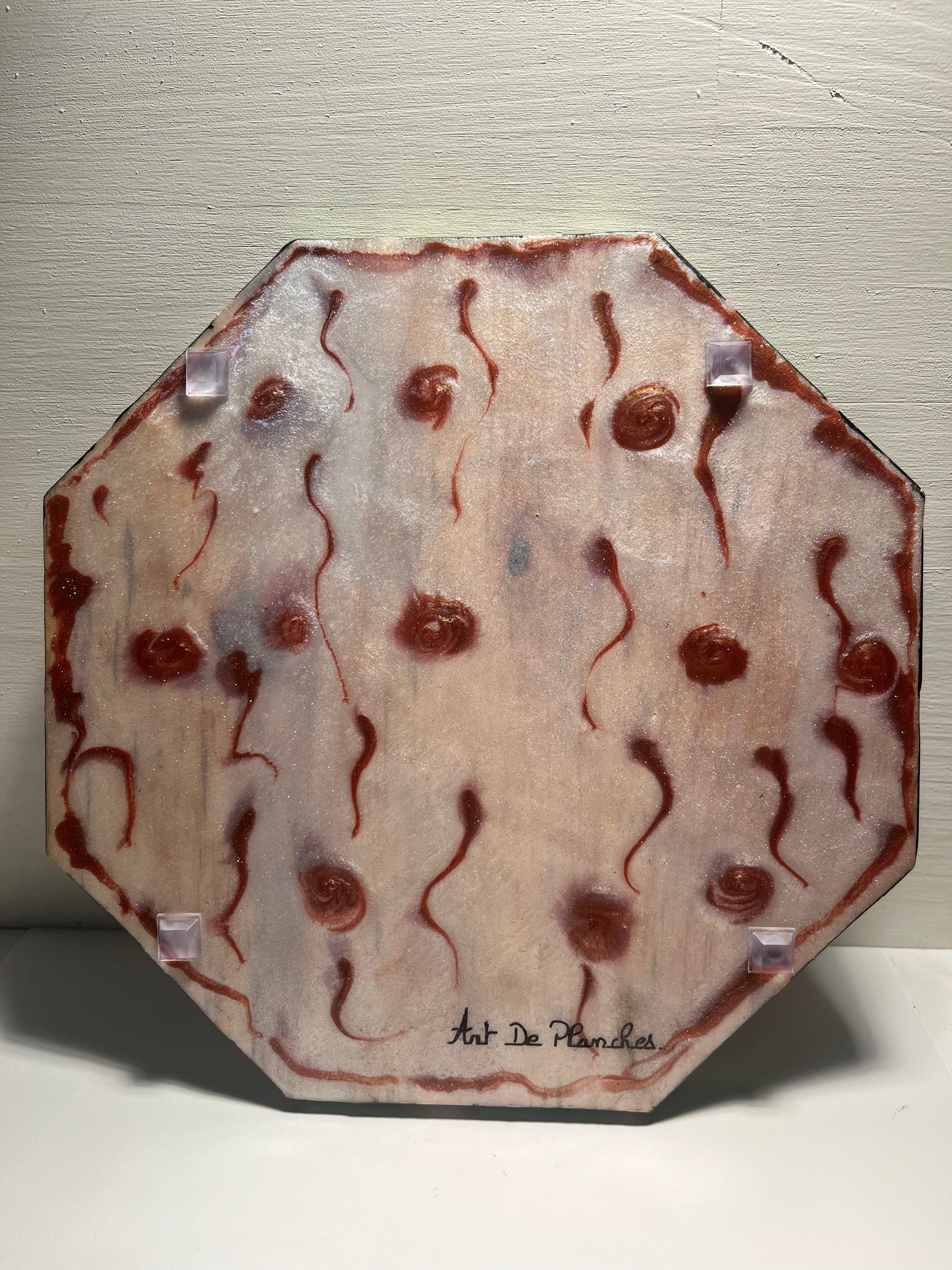 Dessous de plat en bois, décoré avec de la résine uv, représentant les traditions Réunionnaises. Phosphorescent dans le noir.