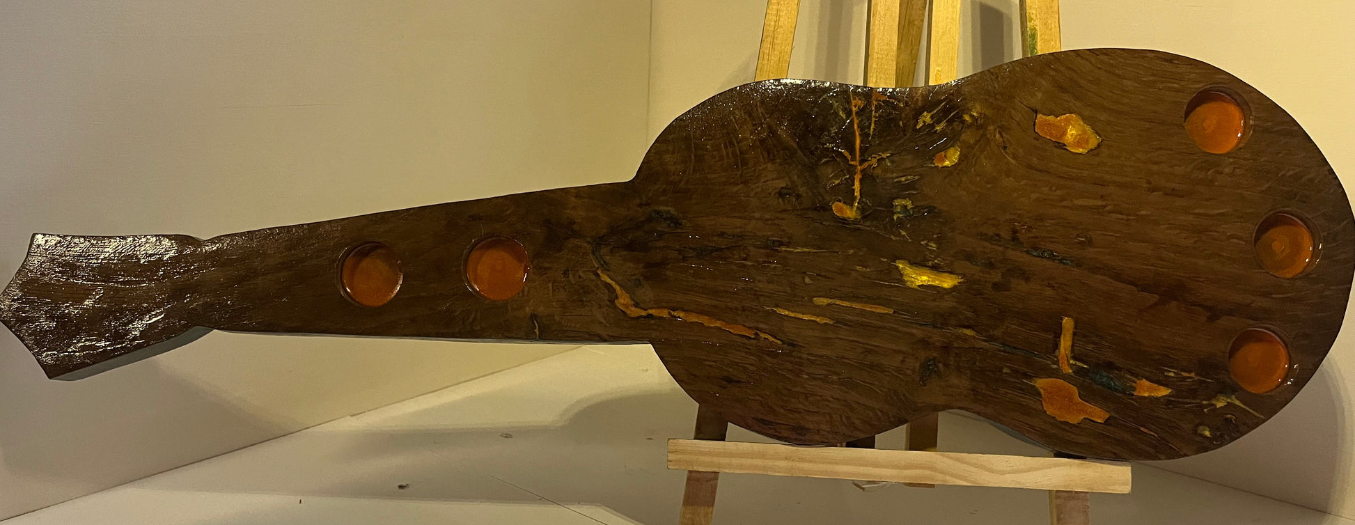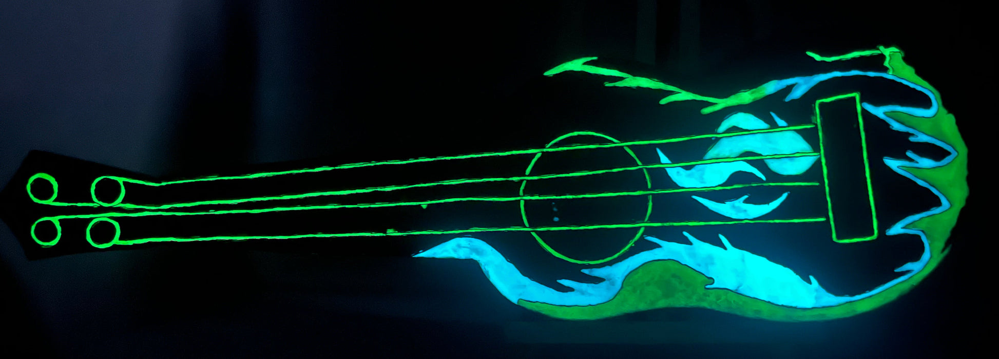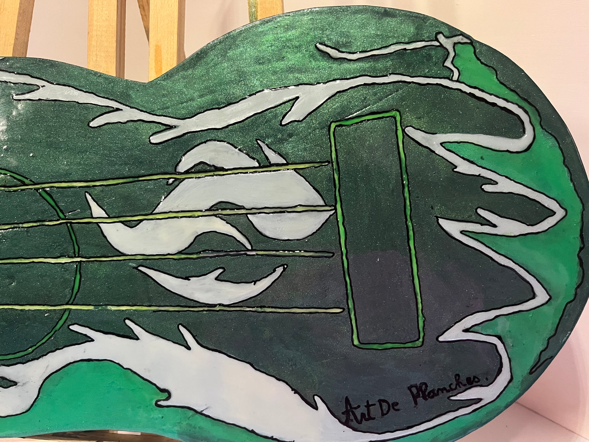 Belle planche apéritive en forme de guitare. Emplacements pour shooters (creux orange). Entièrement en bois de chêne, et décor en résines. Effet phosphorescent.