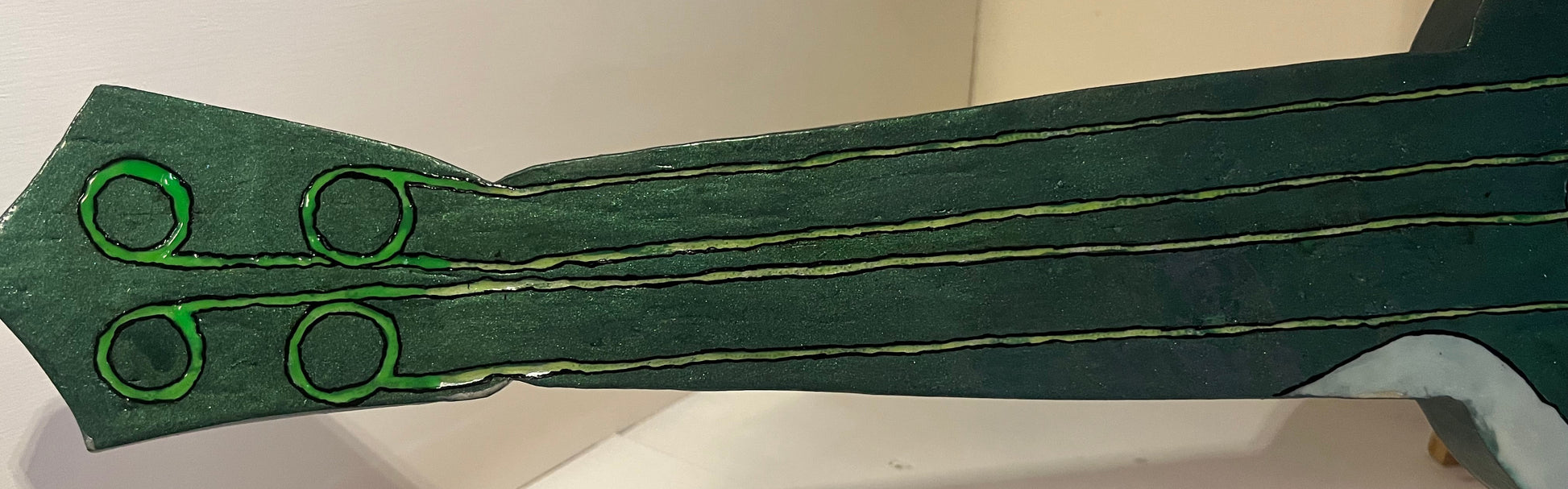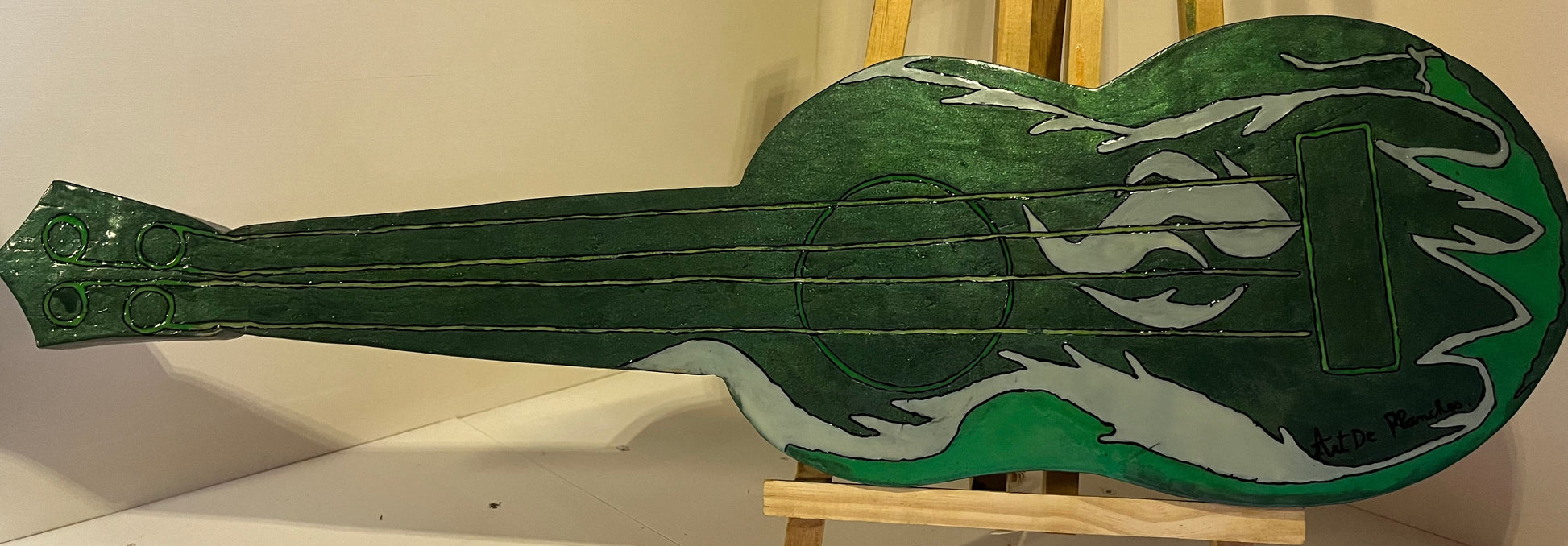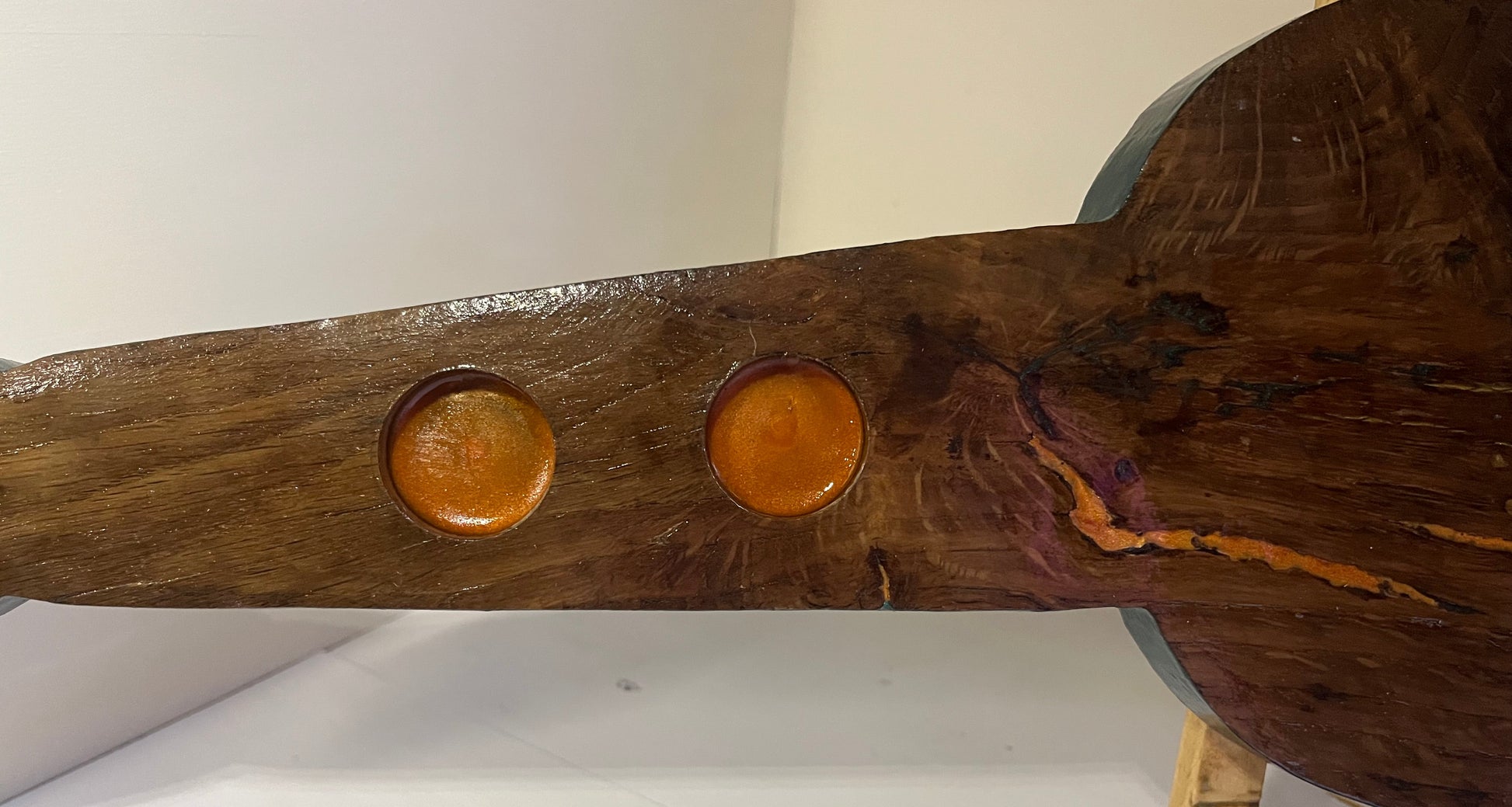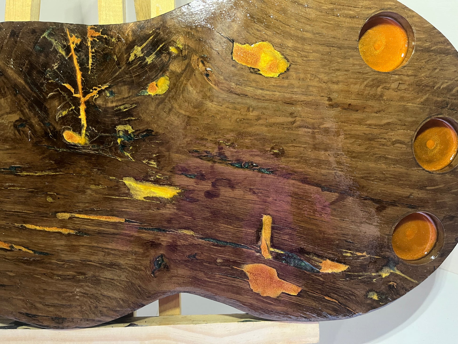 Belle planche apéritive en forme de guitare. Emplacements pour shooters (creux orange). Entièrement en bois de chêne, et décor en résines. Effet phosphorescent.
