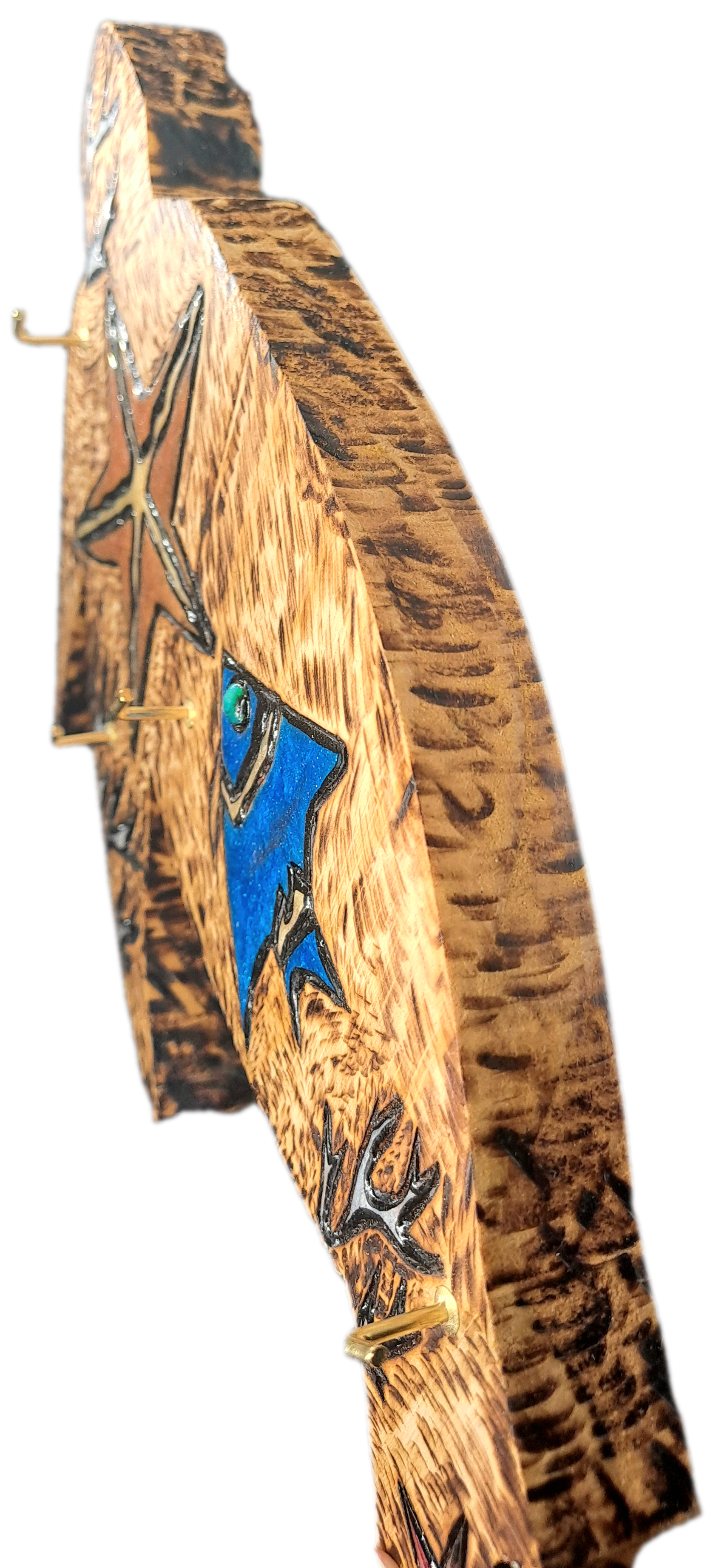 Accrochez toutes vos clés grâce à ce porte-clés mural en forme de tortue! Fabriqué avec une technique de pyrogravure et décoré sur le thème de l'océan, ce porte-clés est à la fois pratique et esthétique. Idéal pour les amoureux de la nature et de la mer.