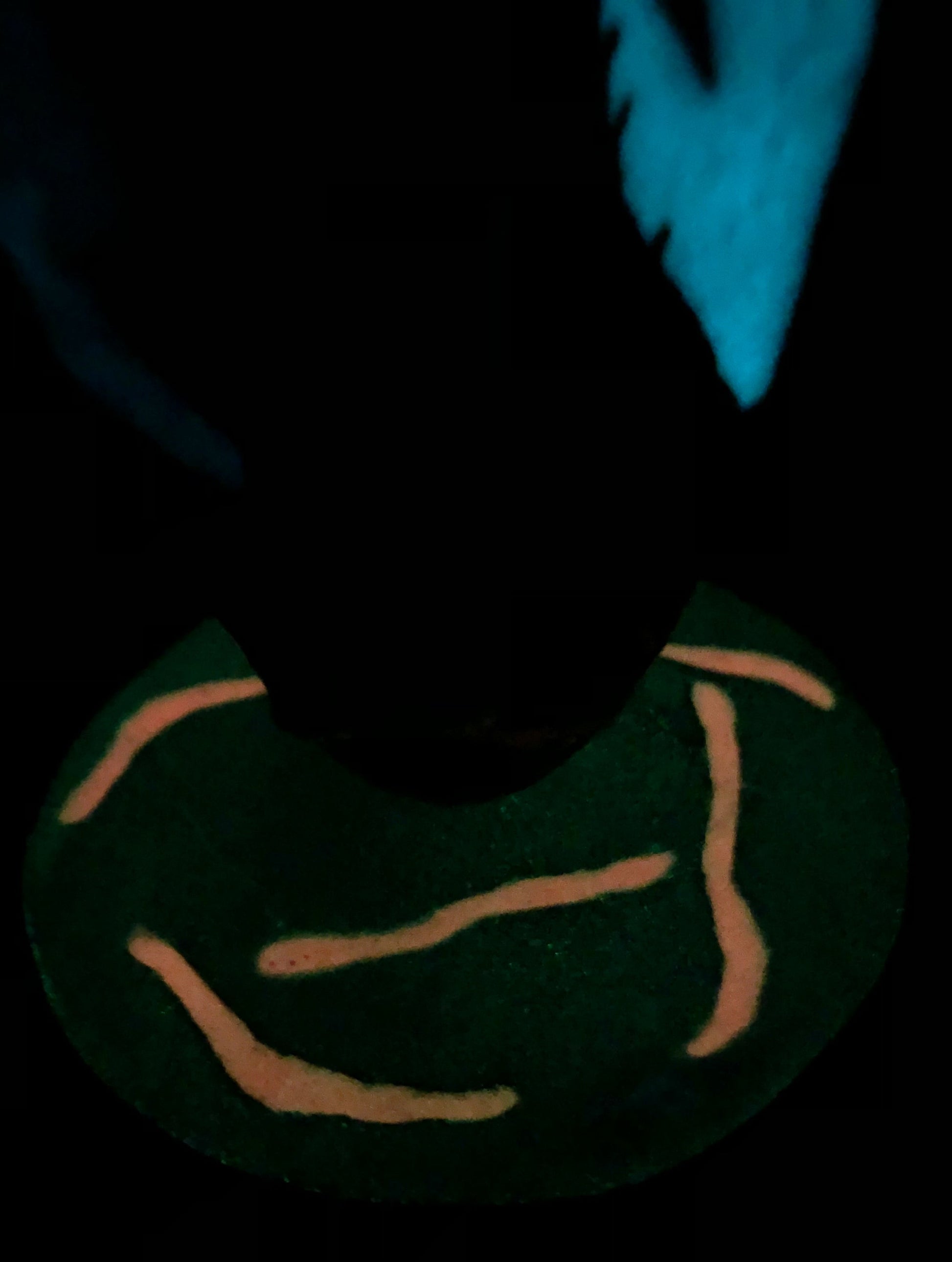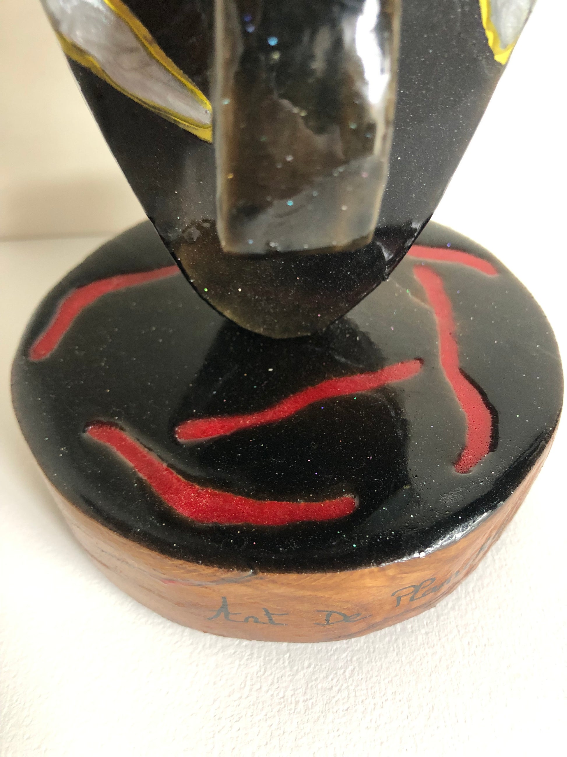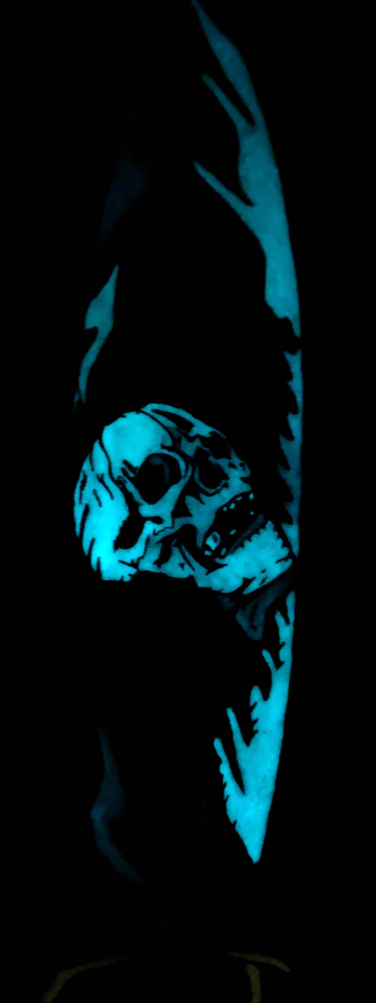 Porte clés sur pied en forme de planche de surf. Socle en bois de chêne, planche en bois simple. Décor en résine, et phosphorescent.