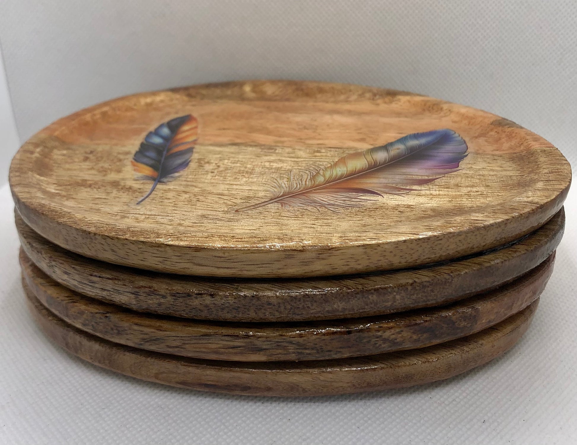 Ces petits plateaux en bois sont parfaits pour ajouter une touche de décoration à votre maison. Le lot de 4 plateaux est décoré de jolies plumes pour un look naturel et élégant. Idéal pour servir des apéritifs ou pour mettre en valeur vos objets préférés. Ajoutez de la chaleur et de la beauté à n'importe quelle pièce avec ces plateaux en bois uniques.
